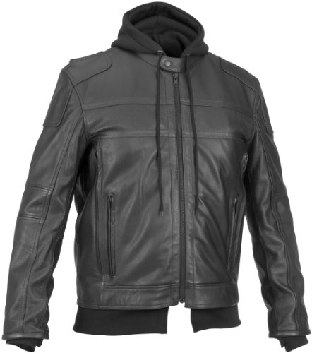 FeaturesPremium leather provides protection as well as a great look and feel.The removable, fully-sleeved zip out hoody can be worn separately.2 large vertical front intake vents and 2 rear vertical exhaust vents keep you cool.Perforated leather panels across the chest, upper back and arms offer added ventilation.Snap-down collar provides a secure, comfortable fit. River Road Cavalier Hooded Leather Jacket (44) (BLACK)?